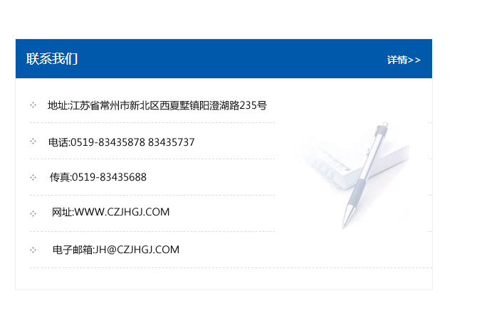 傳真:0519-83435688    郵編:213135    網址:WWW.czjhgj_com.xrlxs.com    電子郵箱:JH@czjhgj_com.xrlxs.com